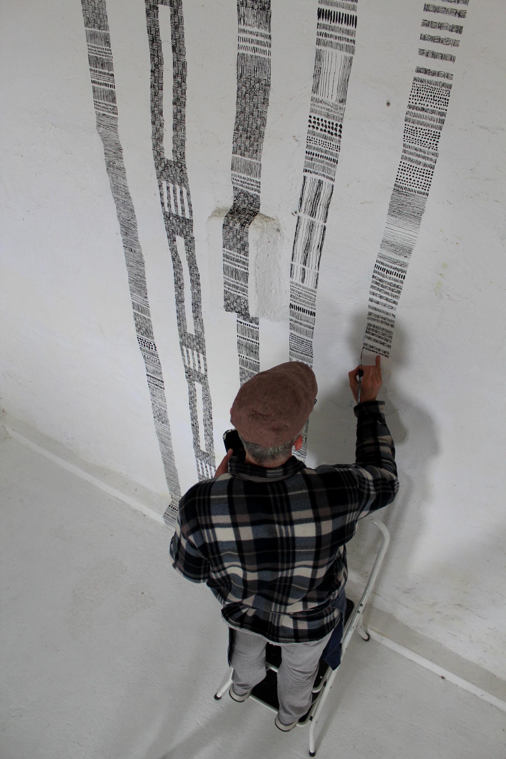 Traits peints sur 273 plaques de plâtre bleues assemblées au mur