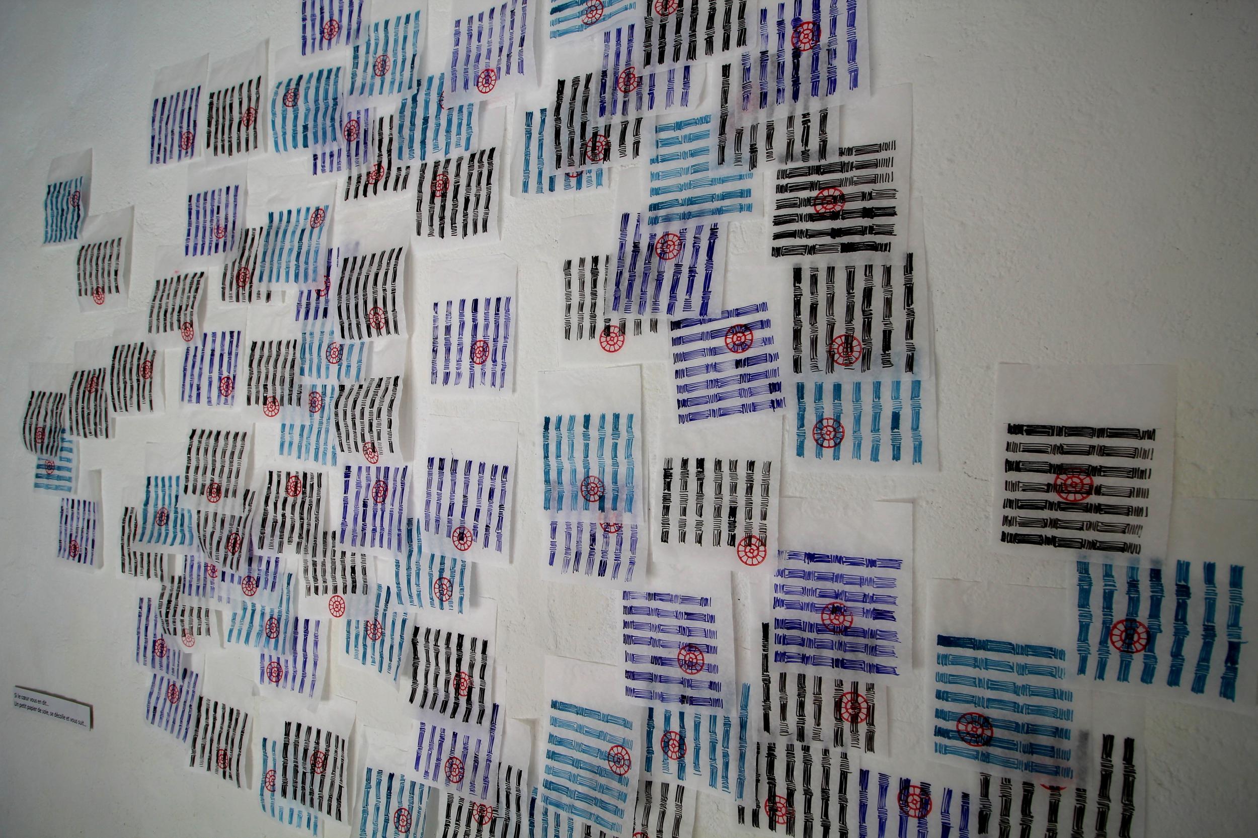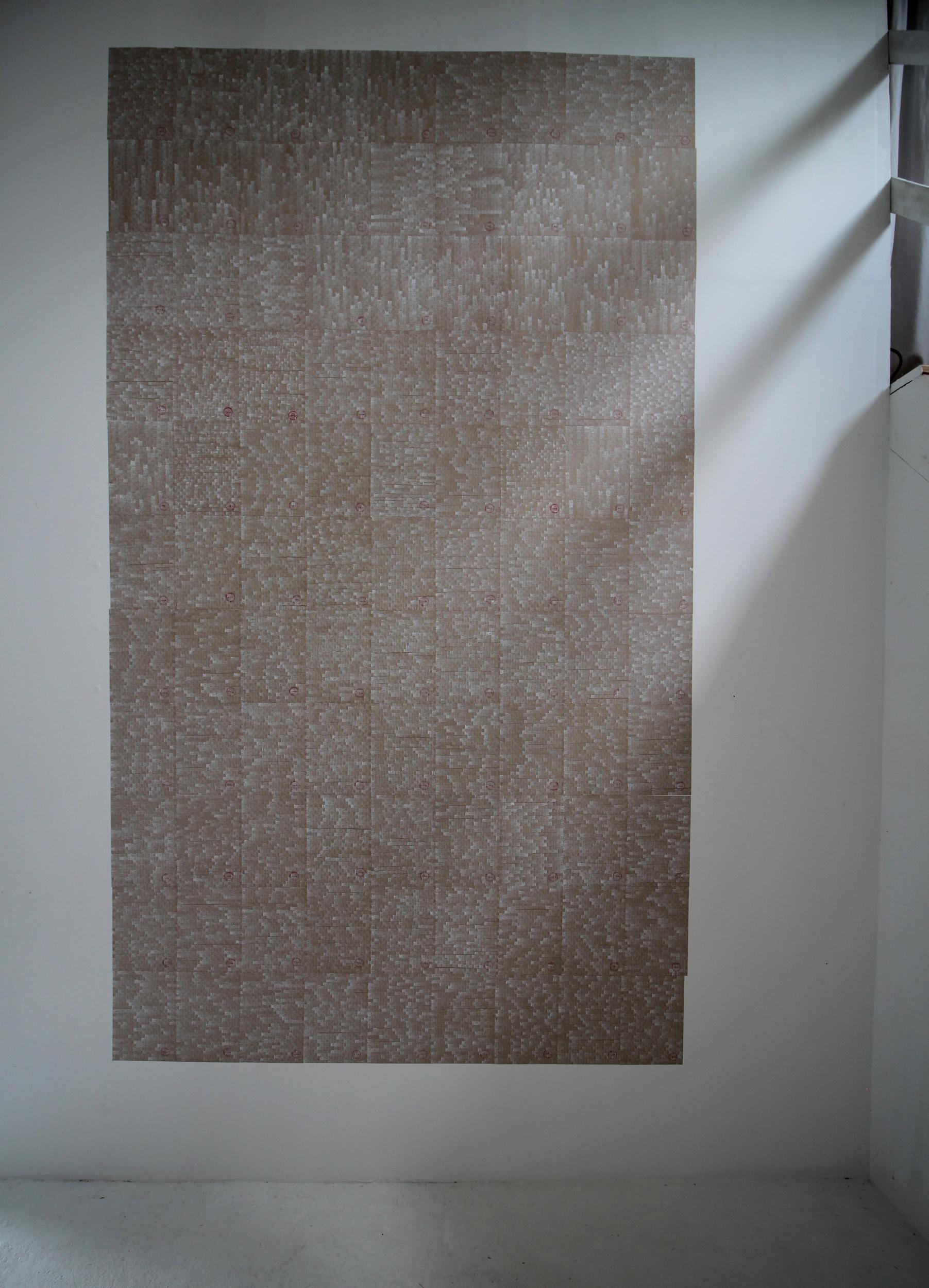 Peinture sur 99 feuilles de papiers Kraft A4, collées sur le mur